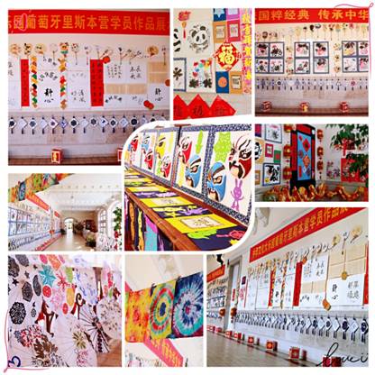 走進(jìn)大廳,“品味國粹經(jīng)典,傳承中華文化,中華文化大樂園葡萄牙里斯本營學(xué)員作品展示”大型條幅高高懸掛在展廳正中。條幅下方,是制作精美的一米見方的中國地圖剪紙作品。宣紙、團(tuán)扇、紙盤上表現(xiàn)的繪畫、書法等美術(shù)作品放滿了墻面。另一面墻上,孩子們用水墨顏料繪制的花紙傘充斥著濃郁的江南水鄉(xiāng)氣息。懸吊在梯階上成排的火紅燈籠與年畫、春聯(lián)遙相呼應(yīng)。