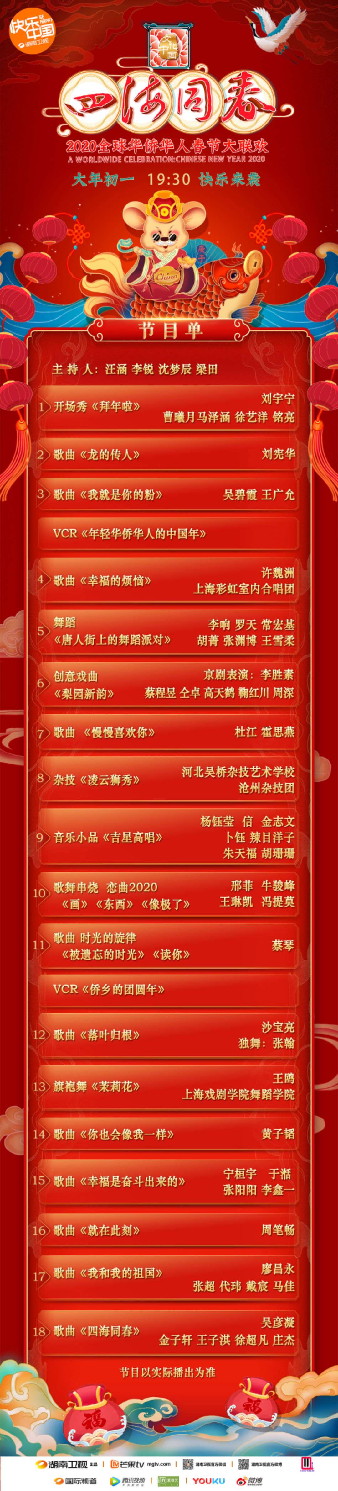 由國務院僑務辦公室主辦,湖南衛(wèi)視承制的“文化中國·四海同春·2020全球華僑華人春節(jié)大聯(lián)歡”將在1月25日(正月初一)晚19:30播出。