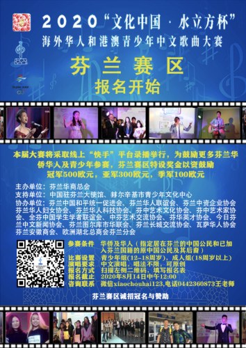 6.2020“文化中國•水立方杯”芬蘭華僑華人中文歌曲大賽將是一個集文化、修養(yǎng)、幸福、健康與快樂的大舞臺。歡迎芬蘭各位華僑華人朋友及其子女踴躍報名參加。報名請掃下面的二維碼,報名截止2020年8月14日12:00。
