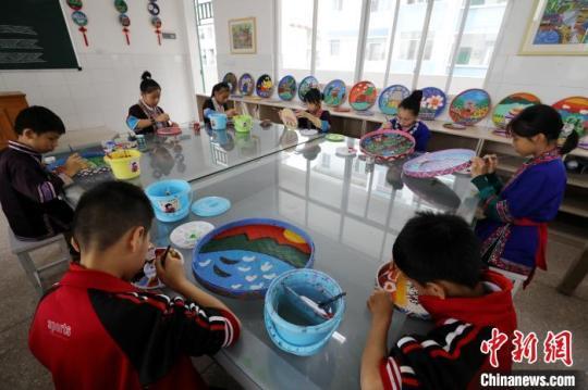 中國僑網(wǎng)11月6日,在廣西三江侗族自治縣民族實驗學(xué)校,學(xué)生們在簸箕上繪制侗畫?!蔷殑住z