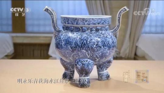 從第一季開始,《國家寶藏》Logo上的“藏”字就讓人印象深刻,這個藏在“藏”字中的器物,就是節(jié)目介紹的第一件國寶——明永樂青花海水江崖紋三足爐。