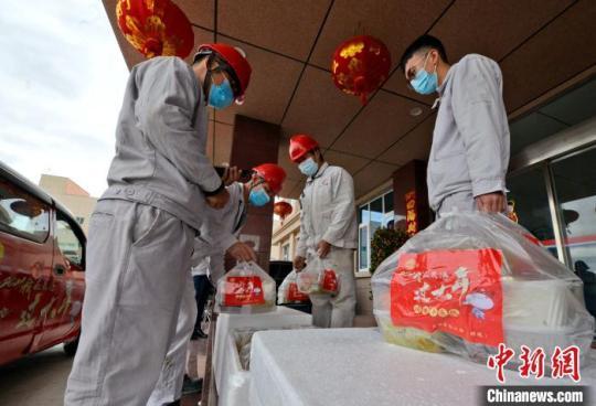 堅守崗位的石化工人正在領取年夜飯。林弘梫 攝
