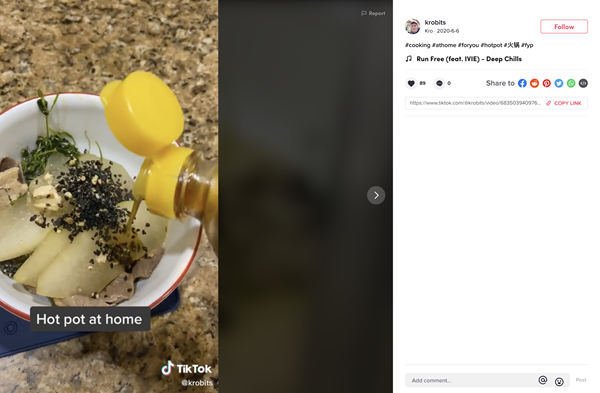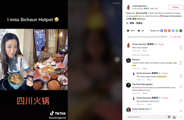 @cookingbomb 是一位美食網(wǎng)紅博主,中文名叫袁倩祎。她在TikTok上教外國人做中國美食,已收獲170萬粉絲,平均每條視頻播放量數(shù)十萬次。其中,一條懷念四川火鍋的視頻,收獲5萬多點贊。留言區(qū)同樣有很多想吃火鍋的人。
