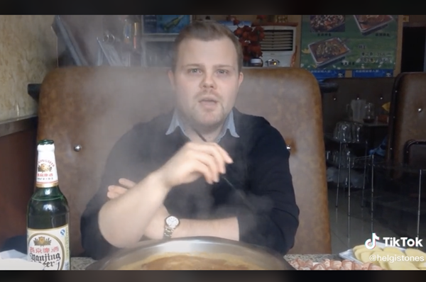 一條TikTok視頻記錄了這家北歐餐館里的火爆場景。紅色的燈光,墻上一張京劇臉譜,屋內坐滿了外國人。他們有的兩人小聚,有的四五成團,圍坐在火鍋前。他們有模有樣地拿著筷子,仔細地從鍋里撈上肉,放進醬料碟里蘸一下,再慢慢地送入嘴中。熱氣騰騰的火鍋前,大家說著笑著,熱鬧非凡。