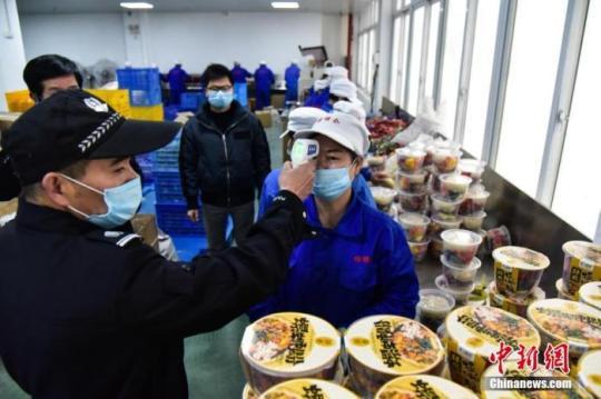 資料圖:2020年2月10日,廣西柳州市的螺螄粉企業(yè)復(fù)工,企業(yè)一天分三次在大門、車間和食堂對(duì)工人測(cè)量體溫,防止工人帶病工作交叉感染。中新社記者 王以照 攝