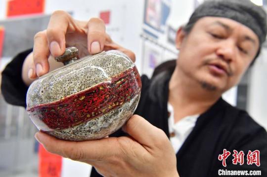 圖為黃守堃展示自己創(chuàng)作的陶瓷漆藝作品?!埍?攝