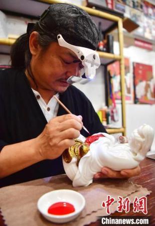 圖為黃守堃正在對瓷燒觀音像上第18道大漆。張斌 攝