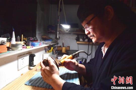 圖為黃守堃正在制作定制的茶盤,他還采用了文物修復(fù)中展現(xiàn)立體圖騰的技法將客戶的姓氏圖紋體現(xiàn)在茶盤上?!埍?攝