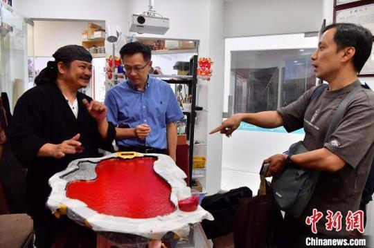 圖為黃守堃(左)在工作室和朋友一起交流漆藝創(chuàng)作。張斌 攝