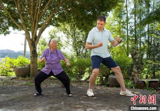 中新網(wǎng)寧波9月23日電(記者 李典)“削”“掌”“插”……23日,浙江省寧波市寧??h力洋鎮(zhèn)東園村的一處院子里,來自英國的Sam跟著98歲的東園村村民張和仙、村民馮傳引學(xué)習(xí)中國傳統(tǒng)武術(shù)——拳法和棍棒。