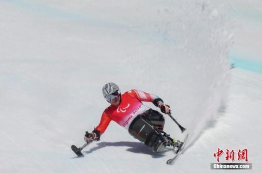 3月7日,瑞士選手穆拉特·佩利特在比賽中。當日,北京2022年冬殘奧會殘奧高山滑雪男子全能 - 坐姿決賽在延慶國家高山滑雪中心舉行。 中新社記者 楊華峰 攝
