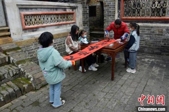 勞會(huì)領(lǐng)著孩子們?cè)诖筇J村古宅里寫春聯(lián)。翟李強(qiáng) 攝