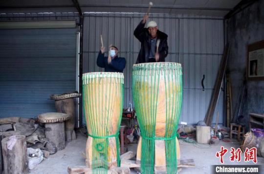 黃平修(右)和他的伙計(jì)一起擂煙墩大鼓。翟李強(qiáng)攝