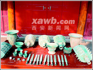 在扶風(fēng)縣博物館,記者見到了窖藏中出土的所有青銅器,除1件鼎稍殘外其他器物均保存完好。其中1件編鐘上發(fā)現(xiàn)族徽,另1件腹內(nèi)有調(diào)音槽。3件精美的雙龍鏤空柄、獸頭耳的舀器斗也讓人愛不釋手。12件銅矛雖然被埋藏了三千多年,但依然異常鋒利,寒氣逼人?脊湃藛T稱,這些矛從未使用過就埋在了地下。還有一組車馬器出土?xí)r被放在編鐘里,有銅泡、銅管等共有103小件,省文物局有關(guān)專家稱,一個窖藏內(nèi)出土大量的銅矛和車馬器,非常少見。