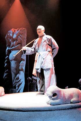 《比茲卡》劇組的人都說(shuō),“譚老是一個(gè)‘符號(hào)’,是貫穿全劇的靈魂。”老人用充滿滄桑的歌喉,吟唱了一曲土家山水,給人展示的是土家民歌的原生態(tài)韻味。盡管人們不一定聽懂老人到底唱的什么,但那時(shí)而深沉、時(shí)而高亢的歌聲,加上那身穿土家長(zhǎng)布衫、頭戴黑絲帕、手握大煙袋的形象,就已經(jīng)震撼了觀眾。