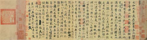 王羲之的行書,在他本人各體之中也應(yīng)排在首位,其行書帖有《姨母帖》、《快雪時(shí)晴帖》、《蘭亭序》、《圣教序》等。但他留下的真跡不多,多是后人臨摹,其中,《蘭亭序》為王羲之行書的最突出代表,被歷代稱為“天下第一行書”。此帖表現(xiàn)了王羲之書法藝術(shù)的最高境界。用筆有藏有露,側(cè)筆取勢,遒媚勁健,自然精妙;章法上疏密斜正,大小參差,斂放揖讓,承接呼應(yīng);結(jié)體上變化多端,匠心獨(dú)運(yùn),文中20多個(gè)“之”字,7個(gè)“不”字,雖重復(fù)出現(xiàn)卻無雷同。可惜這件書林瑰寶,被唐太宗作為殉葬品,埋入昭陵,從此真跡永絕于世。