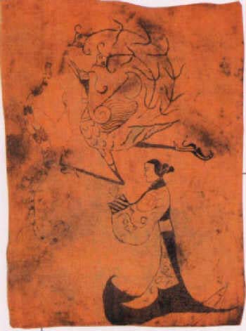 長沙楚墓先后出土了兩幅旌幡性質(zhì)的帛畫。其一稱《人物龍鳳帛畫》,畫中有一身著華美衣裙的女子,雙手拱拜,昂首飛舞的鳳和蜿蜒而動的龍好似向天國飛去。另一幅《人物御龍帛畫》畫的是一俄冠長袍、神態(tài)從容的男子頭頂華蓋,駕馭巨龍遨游飛馳,龍下面繪有一條魚,栩栩如生;龍尾以極簡練手法畫出一引頸放歌的孤鶴。兩幅畫顯然與戰(zhàn)國時流行的飛升成仙思想有關(guān),通過衣冠服飾表現(xiàn)了人物的身份,儀態(tài)肅穆,線條流暢,設(shè)色采用平涂與渲染兼用的方法,顯得莊重富麗,著實體現(xiàn)了當時書畫的水平和特點。