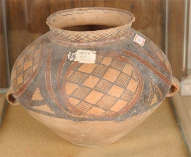 彩繪紋飾,大都采自和當(dāng)時(shí)先民生活關(guān)系密切的自然界形象。原始人能夠捕捉花鳥魚蟲等形象的形態(tài)特征,以寫實(shí)或夸張的手法有力地表現(xiàn)出來(lái),其天真、稚拙的畫風(fēng)讓我們感覺到濃郁的原始?xì)庀。如高明區(qū)博物館藏的新石器時(shí)代的彩陶雙耳罐,上面繪滿了彩陶網(wǎng)紋、方格蚊,畫面形象古樸嚴(yán)謹(jǐn),具有鮮明的繪畫意趣,象征含義豐富而神秘,藝術(shù)表現(xiàn)耐人尋味,引人探微。它們的背后閃耀著我們祖先的迷人智慧。