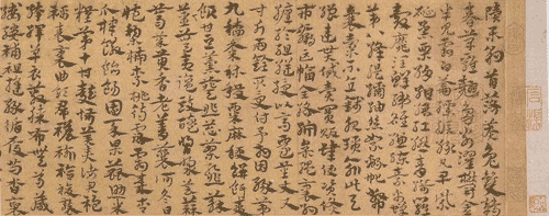 其中,宋克擅長真、行、草諸體,尤以章草名噪一時,作品有草書《急就章》、《出師頌》、《月儀帖》、《豹奴帖》等。宋克(公元1327-1387年),字仲溫,號南宮生,吳郡長洲(今江蘇蘇州)人,少年磊落清爽,任俠使氣,常以李太白、蘇東坡自比。他曾跟饒介學(xué)二王書法,故特別鐘情于草書。他最負(fù)盛名的章草,揮運自如,瀟灑縱橫,十分契合其性格。明代王世貞在《州山人稿》中說:“嘗論章草自二王后,僅一蕭子云,即顏(真卿)、柳(公權(quán))、蘇(軾)、米(芾)以至趙吳興(孟頫),負(fù)當(dāng)代能聲,而不一及之!坝^仲溫《急就章》結(jié)意純美,以為征誅之后,獲睹揖讓,而后偶取皇象石本閱之,大小行模及前后缺處若一,唯波撇小異耳,以豈亦仲溫臨象本耶!爆F(xiàn)藏天津藝術(shù)博物館的宋克章草《急就章》寬13.8厘米,長232.7 厘米,為洪武二十年(1387)年所作。字間茂密,意態(tài)古雅,趨于對“古質(zhì)” 的汲取,字形多顯隸意,使得整幅作品端莊而流利。