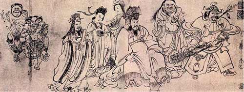初唐的閻立本發(fā)揚了中原作風(fēng),他的《歷代帝王圖》一直是繪畫史上備受推崇的作品,尉遲乙僧則代表了邊陲作風(fēng)。盛唐的吳道子在宗教畫中創(chuàng)設(shè)了“吳家樣”,他的《天王送子圖》描繪佛祖釋迦牟尼降生為悉達王子后,其父凈飯王和摩耶夫人抱著他去朝拜大自在天神廟時諸神向他禮拜的故事。畫中的人、鬼神、獸等完全加以中國化、道教化,體現(xiàn)了佛教在中國本土至唐朝與本地日趨融合的一面。此圖情狀歷歷,技藝高超,想象奇特,令人神馳目眩。所謂衣帶當(dāng)風(fēng),飄然間極盡風(fēng)致,因此被尊為“畫圣”。擅長人物的名家還有周昉、梁令瓚、陳閎、李真、孫位等人。上述畫家都有傳作或摹本存世。個別作品還屬真跡。