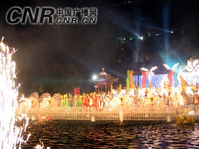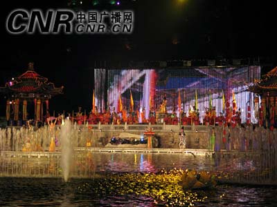 華聲報(bào)西安消息:“七月七日長(zhǎng)生殿,夜半無(wú)人私語(yǔ)時(shí)。在天愿作比翼鳥(niǎo),在地愿為連理枝”,1200年前的“愛(ài)情盟誓”在“七夕”之夜重現(xiàn)盟誓發(fā)生地華清池。7月31日晚,陜西首部大型山水實(shí)景舞劇——《長(zhǎng)恨歌》以驪山為背景、以唐華清宮九龍池為舞臺(tái),在77對(duì)情侶重溫愛(ài)情誓詞中拉開(kāi)了大幕。真山、真水、真景在夜晚色彩斑斕景觀燈光映襯下,營(yíng)造出古今文明水乳交融、美輪美奐的舞臺(tái)效果,使中外觀眾近距離充分感受了盛唐文化的魅力。