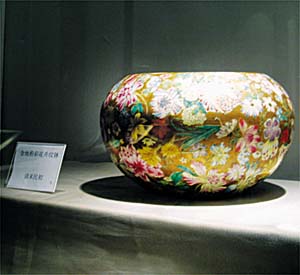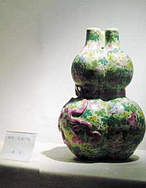 具體展品方面,有嘉慶年間的粉彩花蝶紋碗、道光年間的粉彩人物紋大碗、光緒年間的粉彩堆花博古紋帽筒、光緒年間的珊瑚釉云龍紋大盤、宣統(tǒng)年間的粉彩鳳凰花卉紋大碗。其他的展品還包括豆青地青花開光花鳥紋瓶、金地粉彩花卉紋缽以及粉彩三孔葫蘆瓶。每一件展出品制作工藝精美、造型獨特、色彩艷麗,都代表了當(dāng)時彩瓷的最高水平。