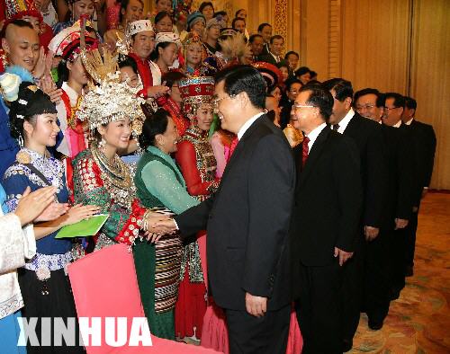 這些演職員代表中,有深受群眾喜愛的著名少數(shù)民族藝術(shù)家,有來自少數(shù)民族地區(qū)的民間歌舞藝術(shù)家,還有來自香港、澳門和臺灣地區(qū)的少數(shù)民族文藝界人士。胡錦濤等黨和國家領(lǐng)導(dǎo)人高興地同身穿鮮艷民族服裝的少數(shù)民族演職員代表親切握手,勉勵他們唱響民族團(tuán)結(jié)主旋律,為繁榮我國少數(shù)民族文藝事業(yè)譜寫新篇章。