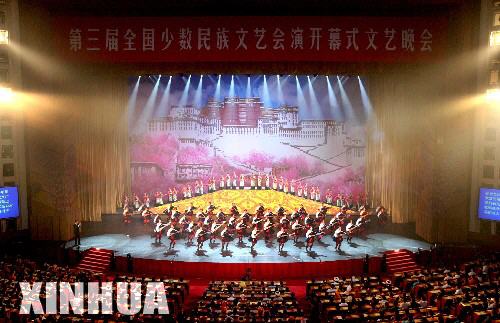 第三屆全國少數(shù)民族文藝會演由國家民委、文化部、廣電總局和北京市政府聯(lián)合主辦。來自全國各少數(shù)民族的4500多名演職員,將于9月5日至25日在北京分別展演33臺優(yōu)秀節(jié)目。