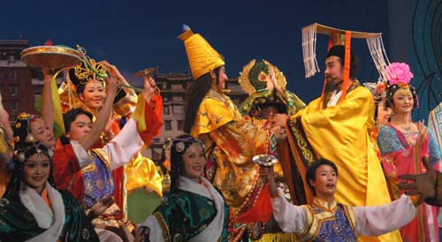 色彩繽紛的民族服飾、優(yōu)美動(dòng)聽(tīng)的山歌酒歌、原汁原味的民族舞蹈……各民族的服飾和歌舞也是這臺(tái)劇目的看點(diǎn)。劇目第一場(chǎng)就是盛世長(zhǎng)安的皇城,文成公主穿著飄逸的唐朝服飾,伴隨著繁華悠遠(yuǎn)的唐樂(lè)翩翩起舞,場(chǎng)面宏大而華貴。