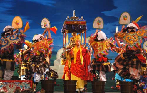 “一段絕妙的聯(lián)姻故事,一條綿亙的古道紐帶,一曲不朽的團(tuán)結(jié)頌歌,一幅壯麗的和諧詩(shī)篇!薄∏嗪J⒓拥谌龑蒙贁(shù)民族文藝會(huì)演的劇目《唐蕃古道》就是以文成公主入藏為主線,以服飾歌舞為主要表現(xiàn)形式。