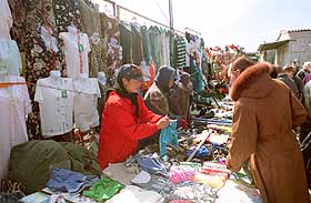 | 隨著中俄邊貿(mào)的發(fā)展,許多中國人到隔江相望的俄布拉戈維申斯克市做生意。圖為黑河市邊貿(mào)人員在布市巴扎拉大市場設(shè)的攤位。 |